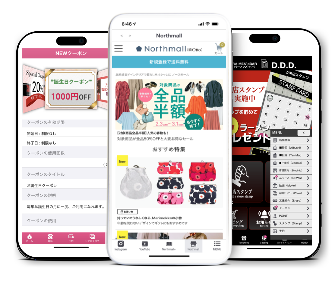 プッシュ通知、店舗アプリ、クーポンEC、予約など豊富な基本機能で販促・マーケティングを強力にサポートします。